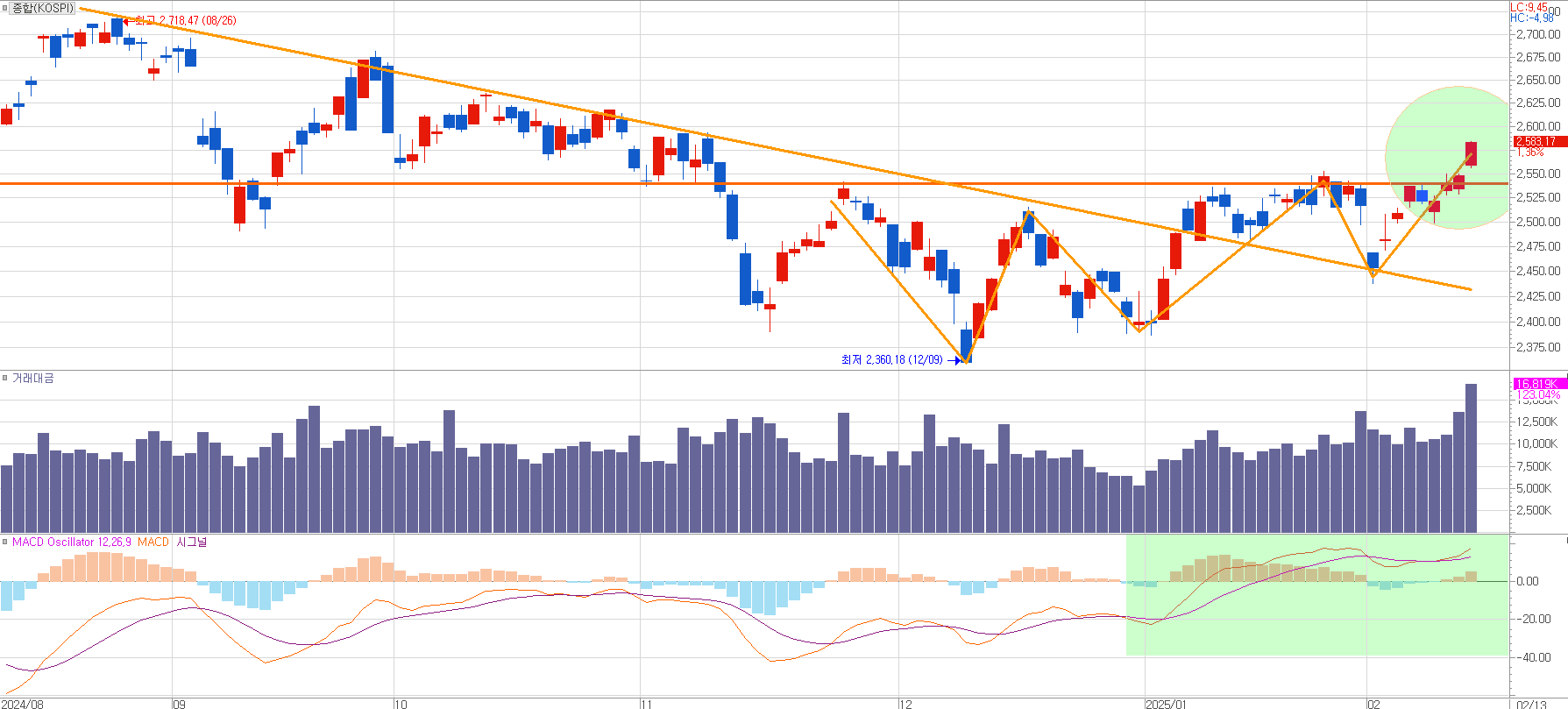 미국의 CPI 악재에도 불구하고 우리 증시는 큰 걸음을 걸으며 앞으로 나아갔습니다. 코스피 2,580p 대에 들어오면서 시장은 점점 상승추세를 굳혀가는 모습입니다. 악재가 산적하여 불안할 것만 같은 증시가 강세를 보이면서, 오히려 시장 참여자들은 이러다 말겠지 싶은 회의감도 가지곤 합니다. 하지만 시장은 이제 바람을 타기 시작했습니다.