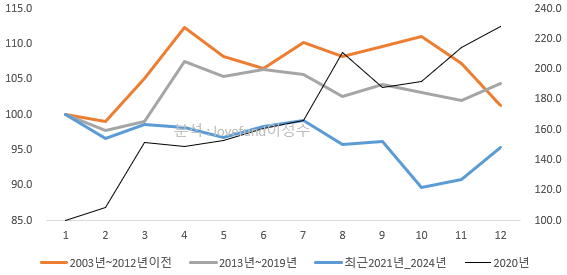 위의 자료는 매년 1월을 100p로 잡고, 2003년~2012년 10년간, 2013년~2019년, 7년, 2021년~2024년 최근 3년의 평균 예탁금 증감을 좌축에 그리고, 2020년의 예탁금 증감을 우축으로 별도로 도식화한 자료입니다.