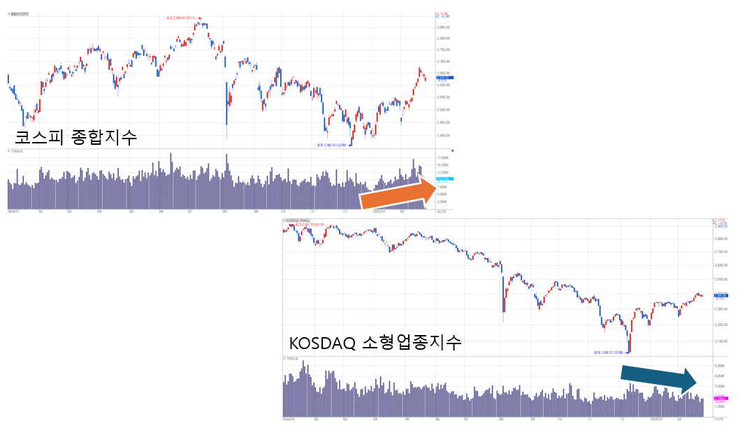 코스피 종합지수는 올해 반등 속에 거래대금이 작년 연말에 비해 소폭 증가하였습니다만, 작년 활활장 수준까지는 회복하지 못한 상황입니다. 그리고 코스닥 소형업종 지수에서는 거래대금이 아직도 작년 연초에 비해 절반도 안 되는 수준에 불과하고 되레 1월에 잠시 증가했던 거래대금이 2월에는 감소하는 현상이 나타나고 있습니다.
