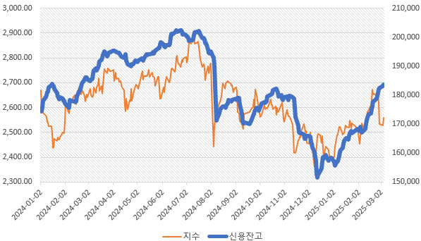 [ 주가지수와 신용융자 잔고 추이. 자료 참조 : 금융투자협회 ]