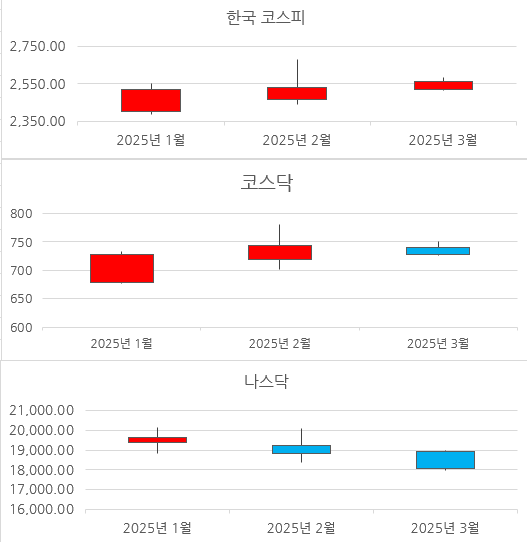 [ 2025년 올해 3월 현재까지의 코스피와 코스닥 그리고 나스닥 월봉 차트 ]
