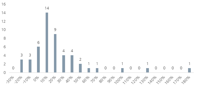 [ 2021년 2월에 선정한 50종목 1년 등락률에 따른 히스토그램 ]