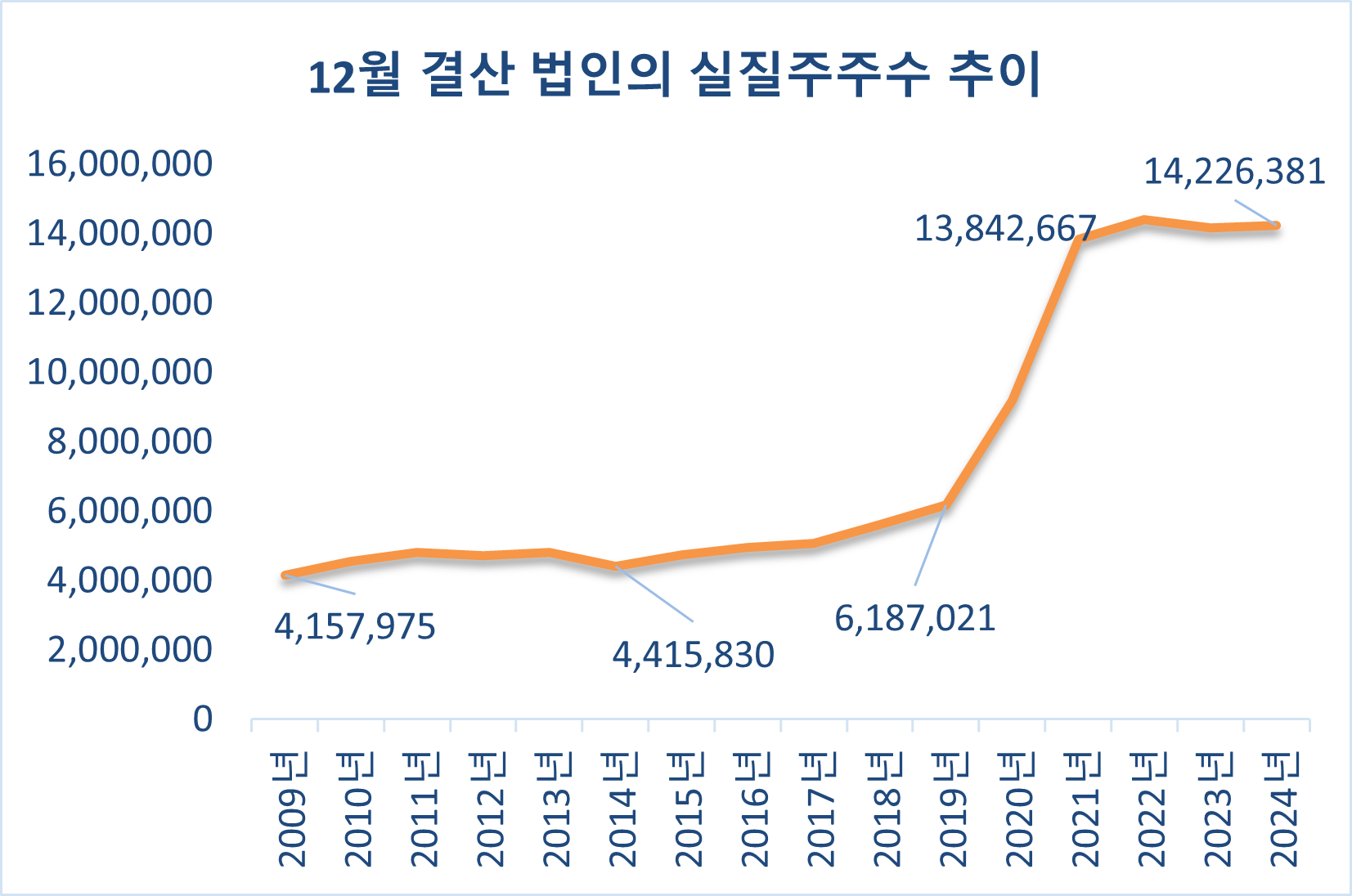 [ 12월 결산법인의 실질 주주 수 추이. 원자료 참조 : 한국예탁결제원 보도자료 모음 ]