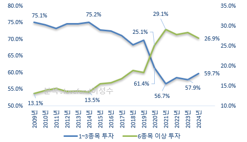 십수 년 전 2010년대 초반만 하더라도 1종목에서 3종목, 즉 극소수의 종목에 집중투자 한 투자자의 비중은 75%에 이르렀고 6종목 이상 보유한 투자자가 13% 수준에 불과하였습니다만, 2010년대 중반을 넘기면서 분산투자를 하는 투자자가 크게 증가하였습니다. 그리고 2020년 동학개미 운동 속에 분산투자를 당연하게 사용하는 투자자가 늘면서 2021년에는 6종목 이상 분산 투자한 투자자 비율이 29.1%까지 높아졌고, 1~3종목에 집중투자 한 투자자의 비율은 56.7%까지 낮아졌었습니다.
