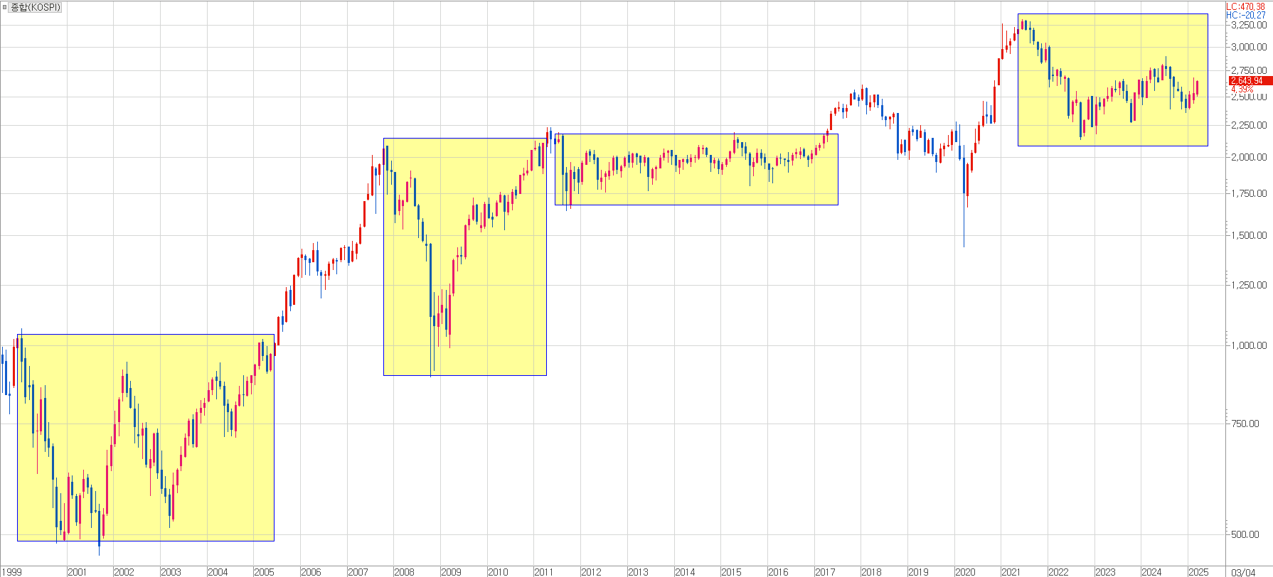 기간 조정 5년여에 이르는 즈음 저의 글을 오래 보아오신 독자님들도 마음속에 일어나는 혼란스러운 마음 이루 말할 수 없을 것입니다. 정치적 불확실성은 계속 이어지고, 트럼프의 발언은 예측불허이다 못해 두려움을 키우고, 극단적인 인플루언서들은 한국은 멸망한다는 식으로 말하니 어찌해야 할지 모르는 혼란에 빠진 투자심리를 더욱 어렵게 만들고 주식이라는 단어 자체에 공포와 패닉심리가 가득하실 것입니다.
