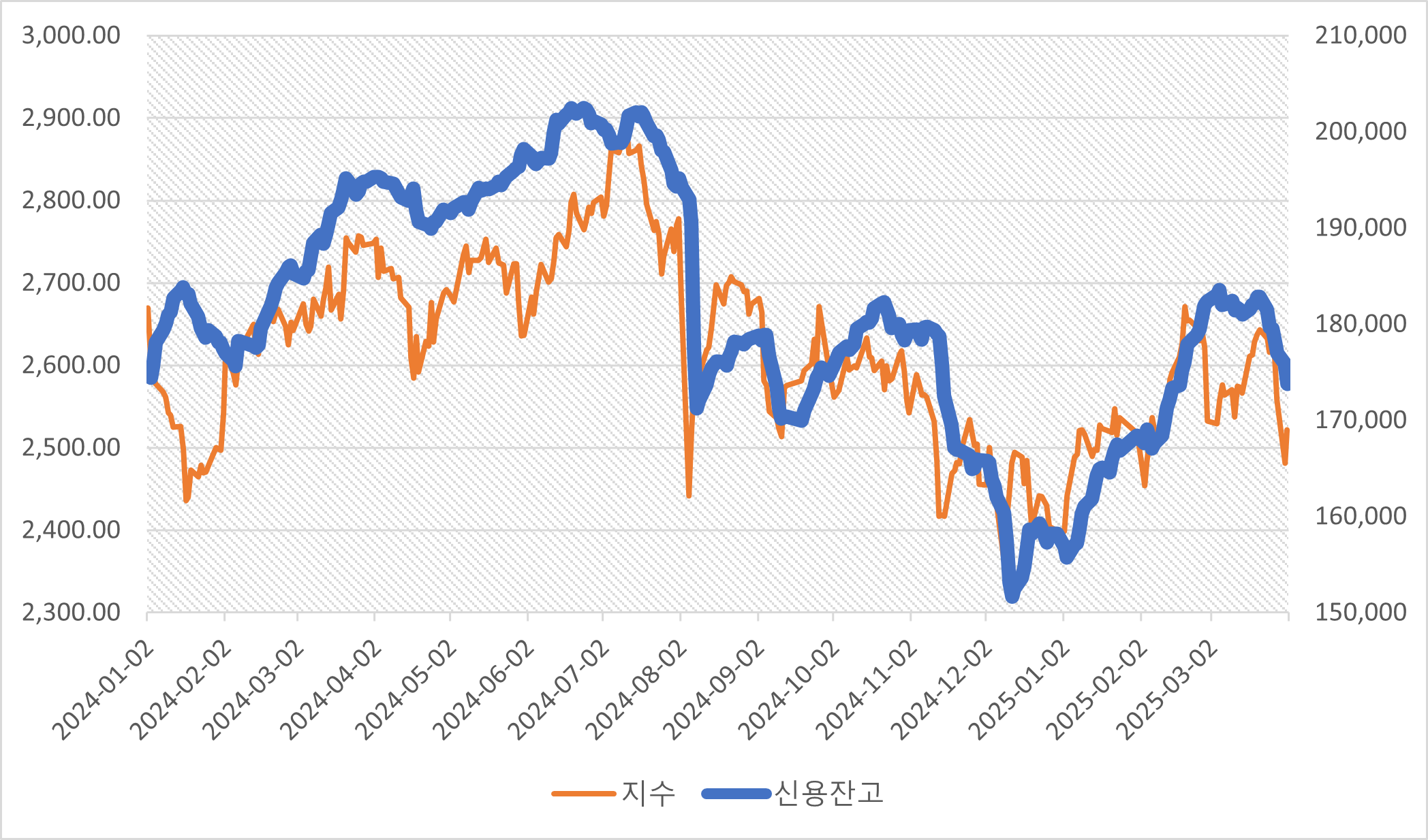 [ 2024년 이후 최근까지 신용융자와 주가지수 추이. 자료 참조 : 금융투자협회 ]