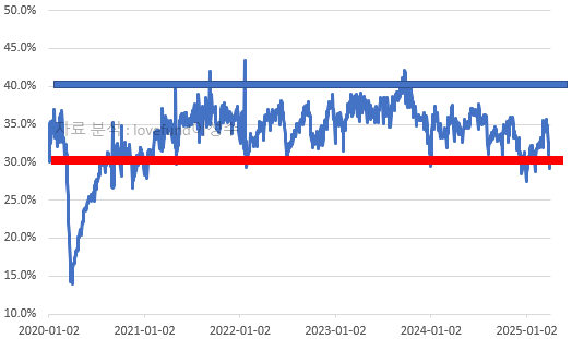 이 비율이 40%를 넘어가면 시장이 과열되어 상투가 발생한 가능성이 커집니다. 예를 들어 2011년 상반기, 2018년 상반기 및 2021년 상반기가 40% 선을 넘어섰었습니다.