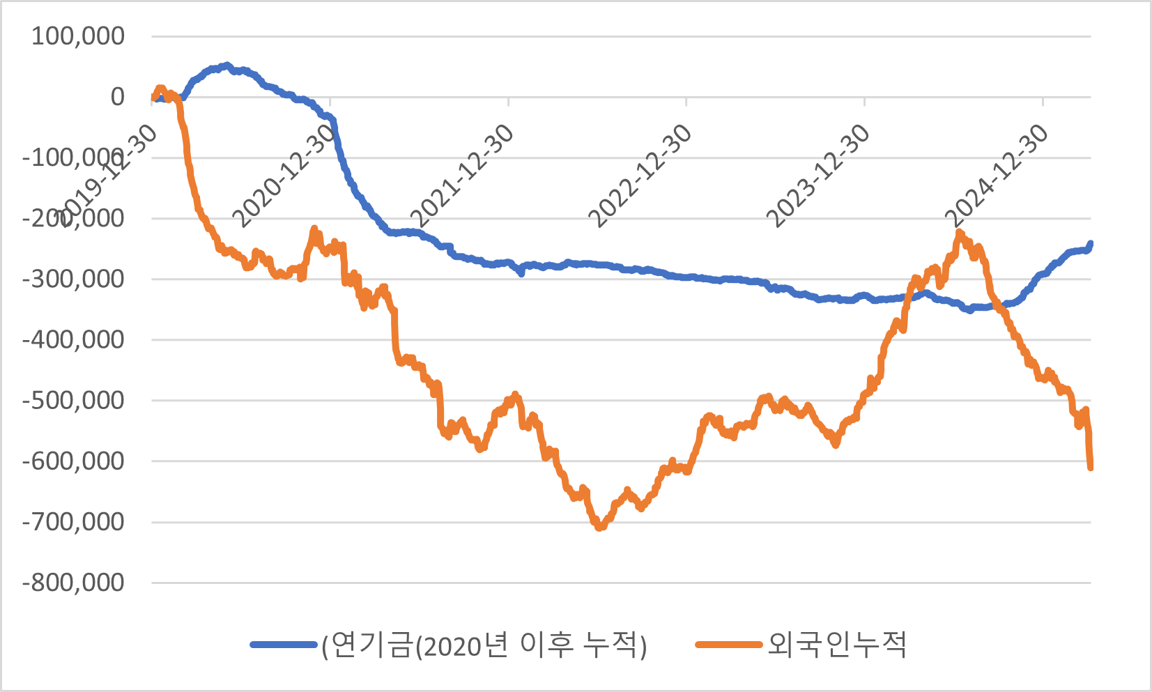 [ 최근 무섭게 매도하는 외국인 vs 꾸준히 매수하는 연기금 수급 추이. 자료 참조 : KRX ]