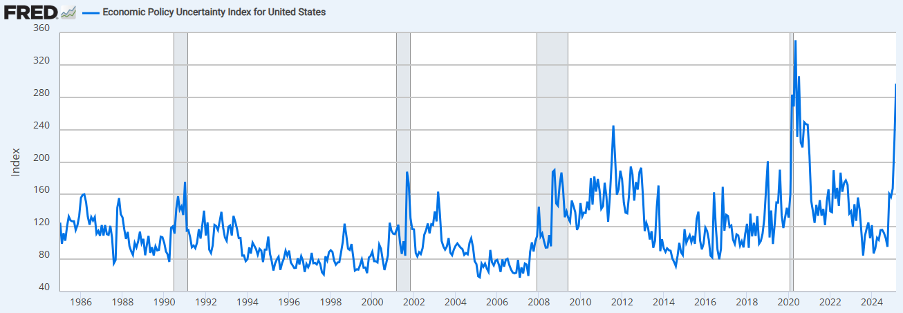 이미 3월까지도 미국의 경제 정책 불확실성 지수는 트럼프 대통령 취임을 앞두고 날카롭게 상승하고 있었는데 4월을 보내면서 사상 최대 수준으로 높아져 있을 것입니다. 그만큼 트럼프 대통령에 의한 스트레스가 크다는 것을 의미합니다.