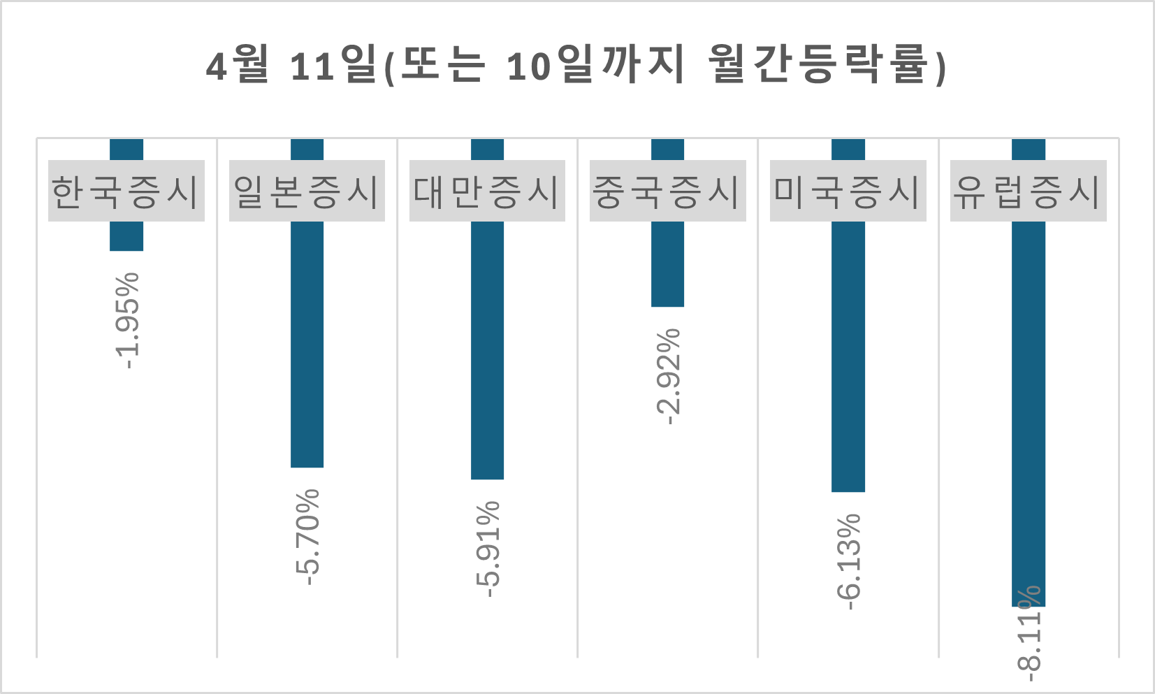 이런 스트레스가 큰 증시였던 가운데 4월 현재까지 (미국 증시는 4월 10일 마감까지) 주요국의 월간 등락률을 비교하여 보다 보면, 한국 주식시장이 상대적으로 매우 선전하고 있다는 것을 관찰하게 됩니다.