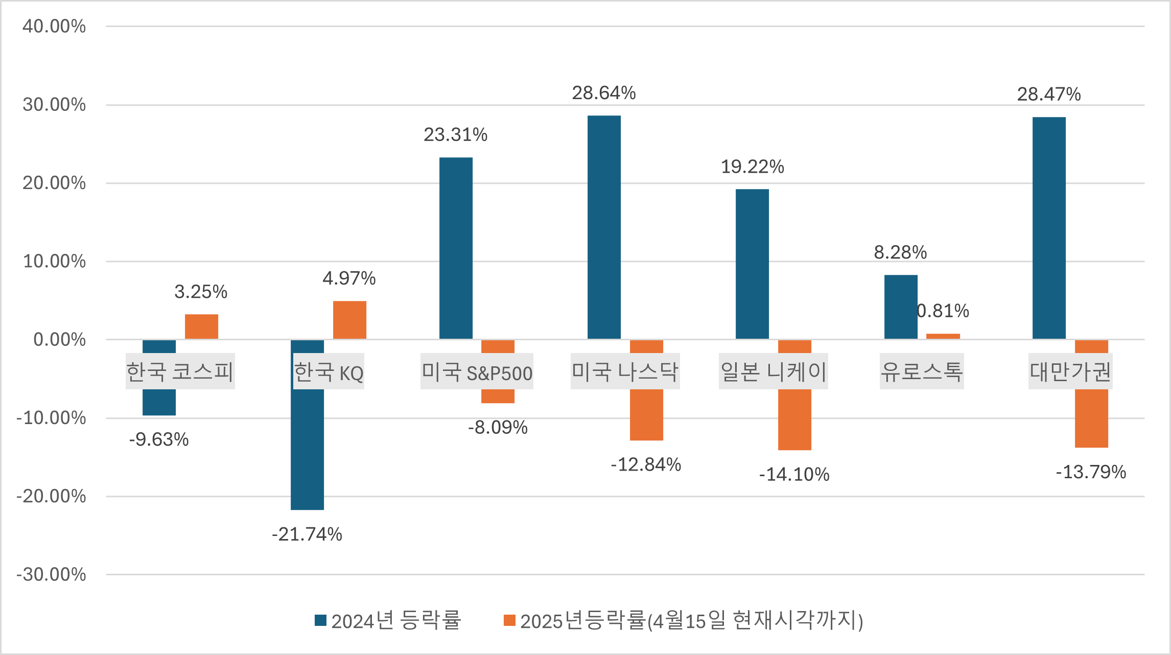올해 들어 주요국 증시가 –10% 수준의 2025년 하락률을 기록하는 동안 한국 코스피와 코스닥 지수는 각각 +3.25%와 +4.97% 상승하고 있습니다.
