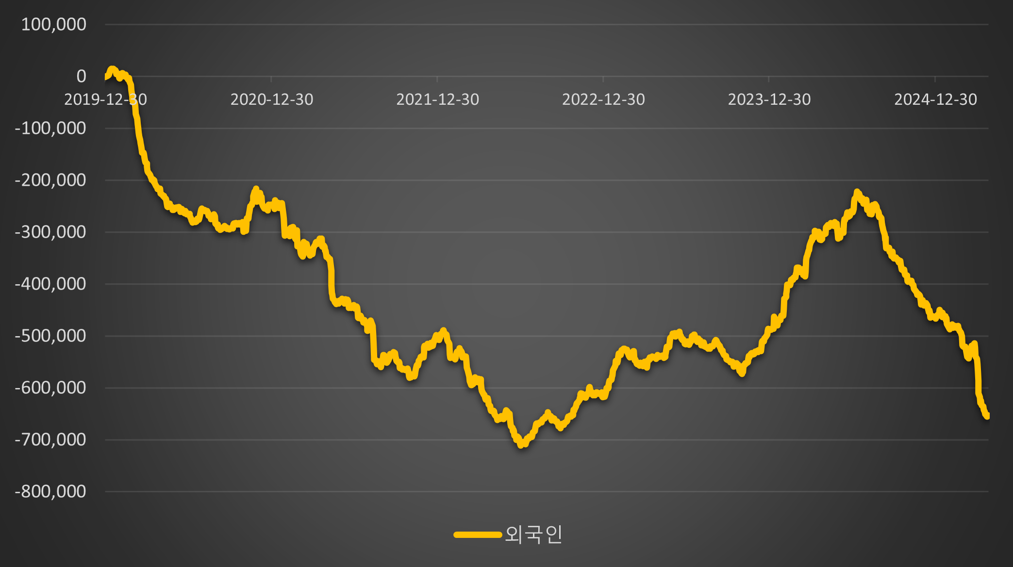 그 이전 2022년 하반기 이후 2024년 7월까지는 외국인의 추세적인 순매수세가 지속되었습니다. 그 규모는 46조 원이 넘습니다. 그런데, 이 규모와 작년 8월 이후 외국인이 순매도한 규모를 함께 도표로 살펴보면 2022년 하반기부터 2024년 7월까지 순매수한 물량을 대부분 그대로 매도했다고 볼 수 있을 정도입니다.