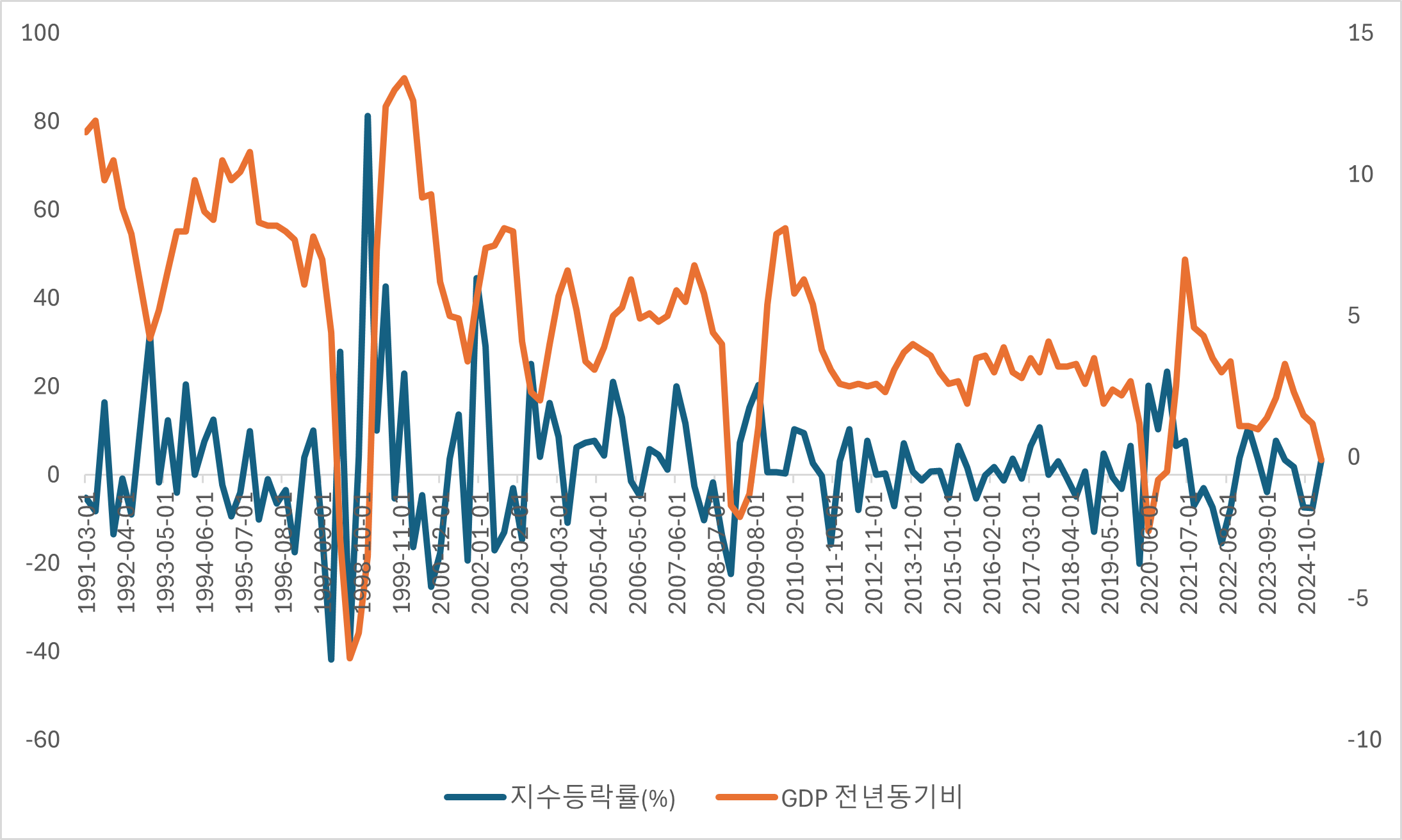 [ 주가지수 분기 등락률과 GDP 전년동기비 추이. 원자료 : 한국은행 ]