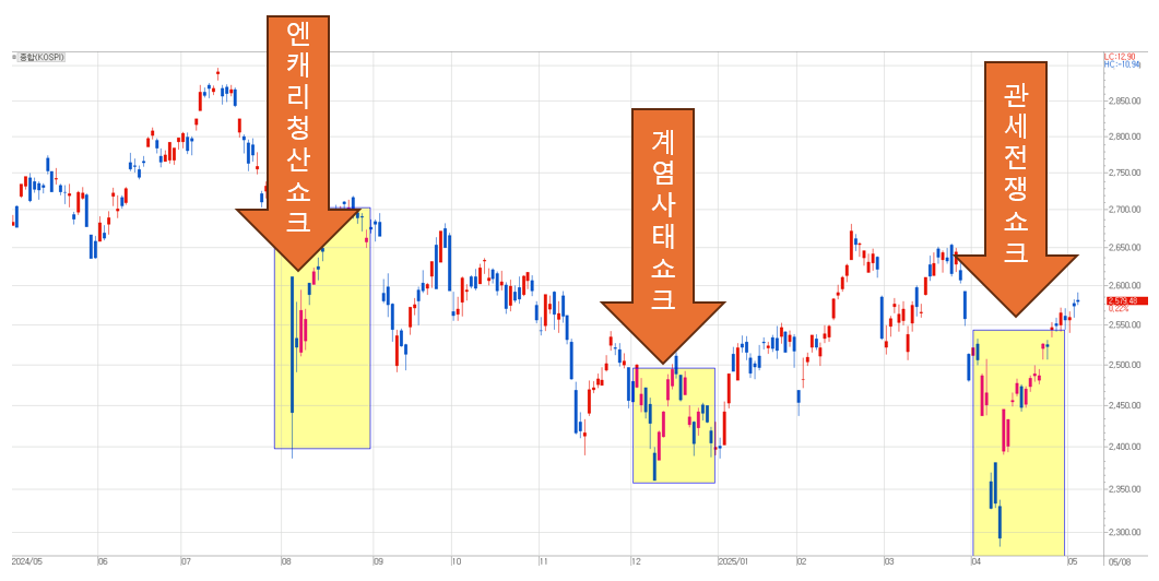 그 이전 8월에 있었던 엔 캐리 트레이드 청산 충격은 코스피 지수를 단숨에 2,700대 후반에서 2,400p까지 무너트리는 충격적인 하락이었습니다. 단 이틀 만에 말입니다. 특히 2024년 8월 5일에 코스피와 코스닥 양 시장이 –8% 넘게 폭락하면서 서킷브레이커가 발동되었을 정도로 충격적인 하락이 있었습니다. 하지만 이후 9개월밖에 지나지 않은 지금 이를 기억하는 투자자는 소수에 불과할 것입니다.