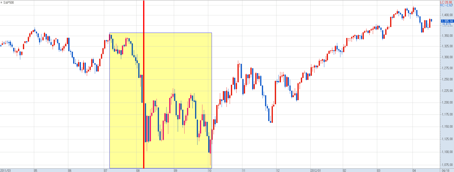 미국 S&P500지수는 7월 고점 대비 8월 4일까지 –11% 이상 급락하였고, 미국 신용등급 강등이 발표된 8월 5일(금) 이후 주말을 보내고 난 후인 그 다음주 월요일에는 블랙먼데이가 발생하면서 주가지수가 –6.7%나 폭락하였습니다. 이후 미국 증시는 급등락을 거듭하다가 10월 초에는 S&P500 지수가 1,100p가 붕괴하면서 7월 고점 대비 –20% 가까운 낙폭을 기록하기에 이릅니다. (※ 당시 한국 증시도 급락하면서 7월 고점 대비 최대 –24% 급락하였습니다.)