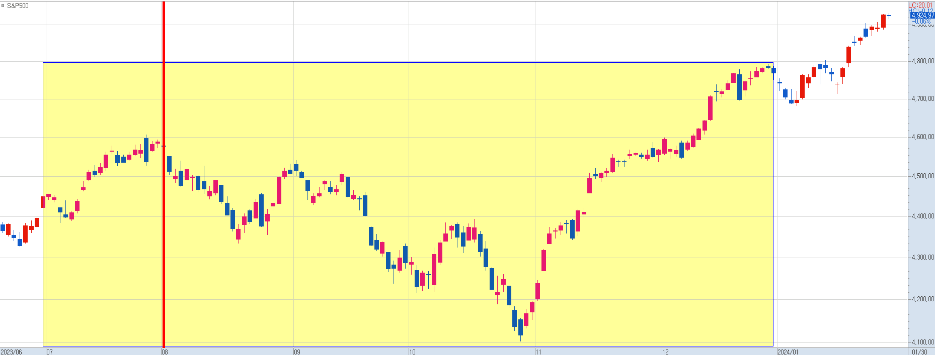 하지만, 이후 11월 들어 시장은 안정세에 접어들고 미국 증시는 2024년 강세장을 만들었습니다. 그리고 이 시기 미국 국채 시장은 의미 있는 흐름은 없었습니다.
