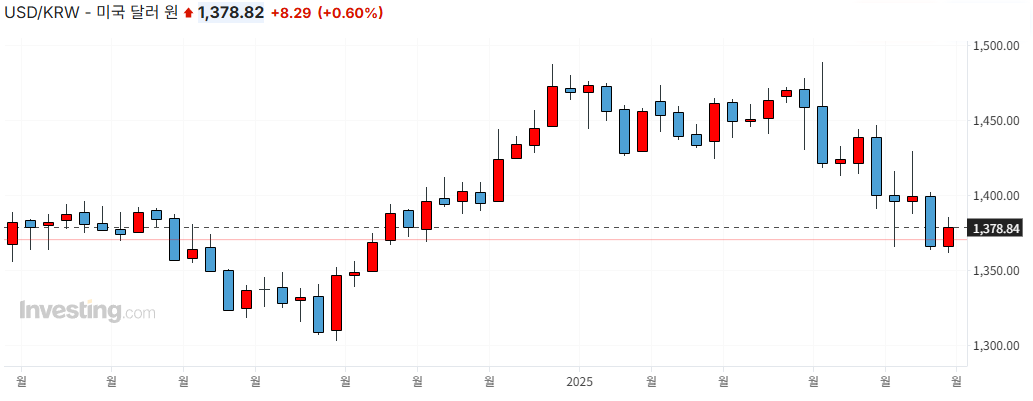 작년 계엄 사태 이후 원달러환율 1,400원대는 뉴노멀처럼 고공 행진을 이어갔습니다. 원달러환율의 고공 행진은 원화 가치 약세를 만들고 한국 자산시장의 매력을 낮추는 원인으로 작용하게 되지요. 그런데, 4월부터 하락추세로 접어든 원달러환율은 5월을 보내면서 1,300원 대로 깊숙하게 내려오면서 안착하였습니다. 5월 마지막 날인 오늘 달러 환율이 제법 강하게 반등하였음에도 불구하고 원달러환율은 1,377원대에 있을 정도이니, 환율이 5월을 보내면서 매우 안정되게 되었음을 확인할 수 있는 대목입니다.