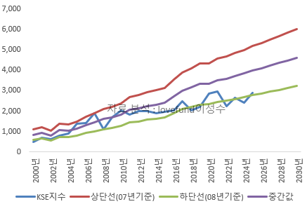 만약, 2007년 활황장 당시 연말 PBR 레벨이었던 1.75배까지 상승한다면 어떤 수치가 나올까요? 위의 PBR 밴드 상단선(적색선)을 보시게 되면 2030년에 6천 선을 돌파합니다. 다만, 이는 우리가 18년 넘게 이르지 못한 PBR 레벨이다 보니 보수적으로 낮은 값을 생각하도록 하겠습니다.