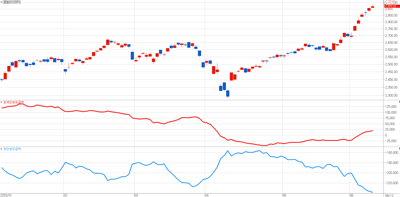 [ 코스피 2,920p에 이른 최근 증시 속 외국인 매수가 재개되었지만, 개인은 팔고 있다. ]