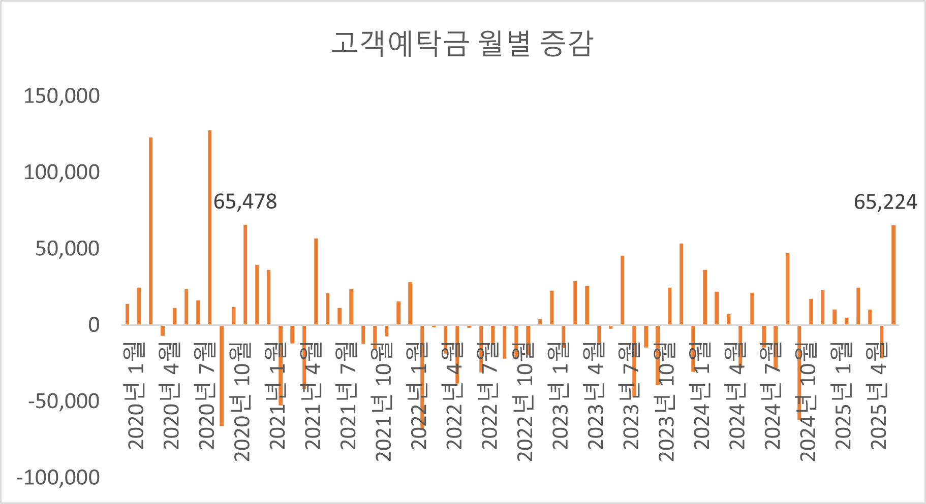 [ 2020년대 이후 고객예탁금 월별 증가 추이. 자료 : 금융투자협회 통계 ]