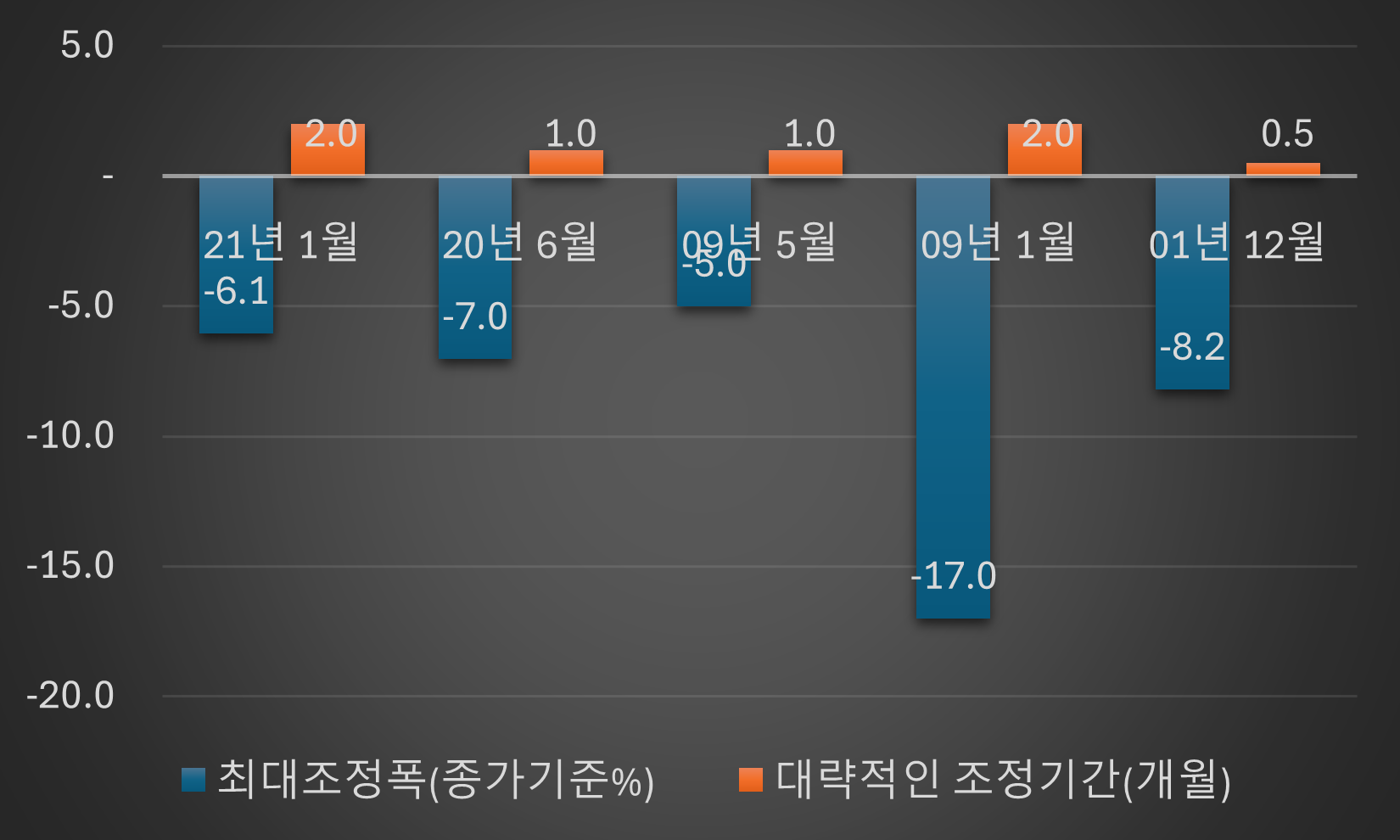 2009년 1월의 경우 금융위기 충격에서 헤어 나오지도 못한 시기였다보니, 숨 고르기 장세 치고는 격한 –17% 수준의 급락이 발생하기도 하였습니다. 하지만 그 이외의 4개의 시기는 –5%~-8% 수준의 조정이었습니다. 작다고 느끼실 수도 있습니다만, 은근히 깊은 조정폭으로 받아들여질 수 있는 수준입니다.