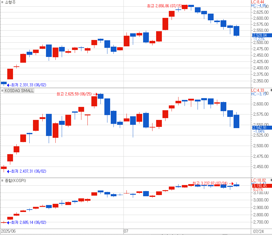 2020년, 21년, 22년, 23년, 24년 5년 동안 겪었던 상황처럼 “또 저런다!!!”라고 투자자들은 생각할 수밖에 없지요. 특히 대주주 양도세 이슈로 인하여 개인투자자가 십수 년 넘게 경험한 혼란, 그리고 2020년 이후 노골적으로 꺾인 스몰캡 하락을 이번 7월 이슈 속에 다시금 떠올릴 수밖에 없습니다.