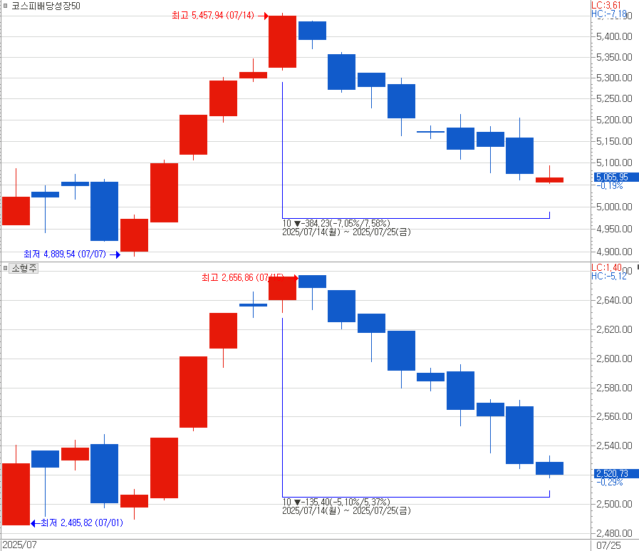 위의 도표는 코스피 배당성장50지수와 코스피 소형업종 지수입니다. 7월 초 상승세를 이어가던 해당 지수는 7월 중순부터 증시 세제 관련 노이즈가 시장에서 회자하고 이번 주에는 아예 노골적으로 뉴스로 쏟아지자, 하락추세를 연일 이어갔습니다.