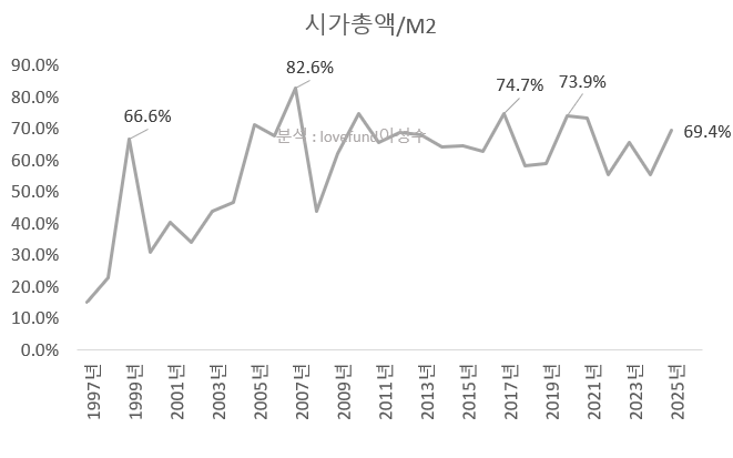 [ M2 대비 시가총액 비율 추이. 원자료 : 한국은행/KRX, 분석 : lovefund이성수 ]