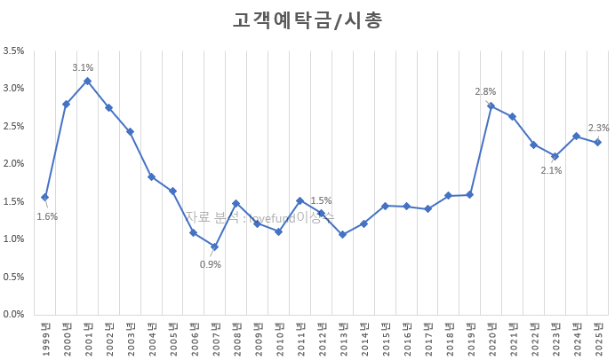 [ 시총 대비 예탁금 비율 추이. 분석 : lovefund이성수 / 원자료 : 금융투자협회,KRX ]