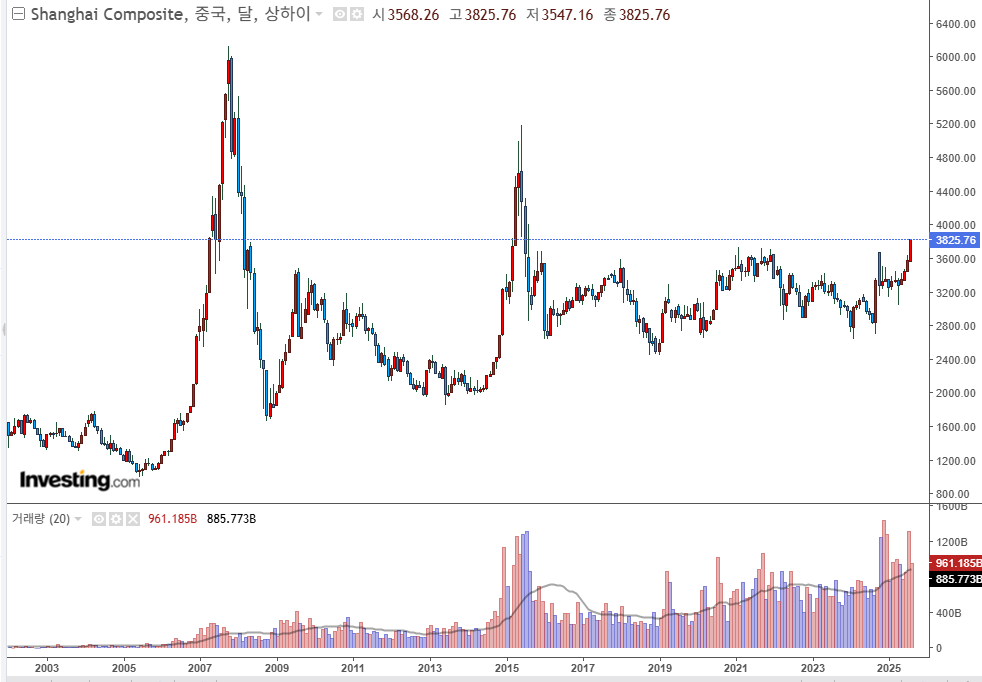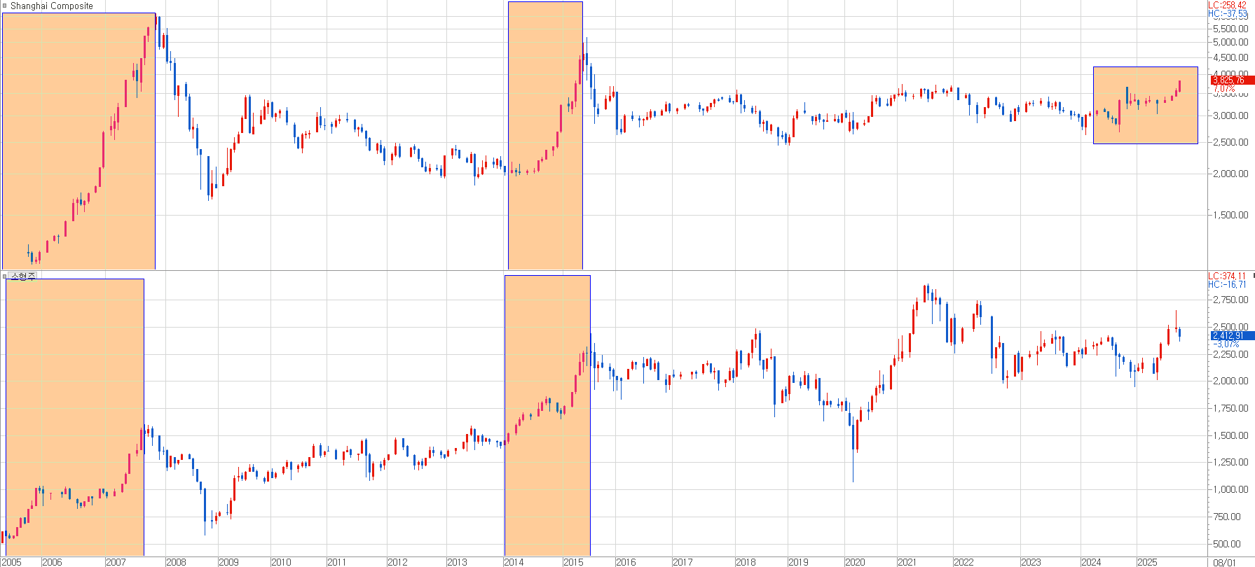 따라서, 만약 중국증시가 지금처럼 (급하지 않게) 꾸준한 상승을 이어간다면, 어느 순간 한국증시도 억지로 끌려가듯 방향을 잡아줄 것입니다. 그러고 보니 2005년, 2015년, 2025년 10년마다의 흥미로운 현상이 나타나고 있군요.