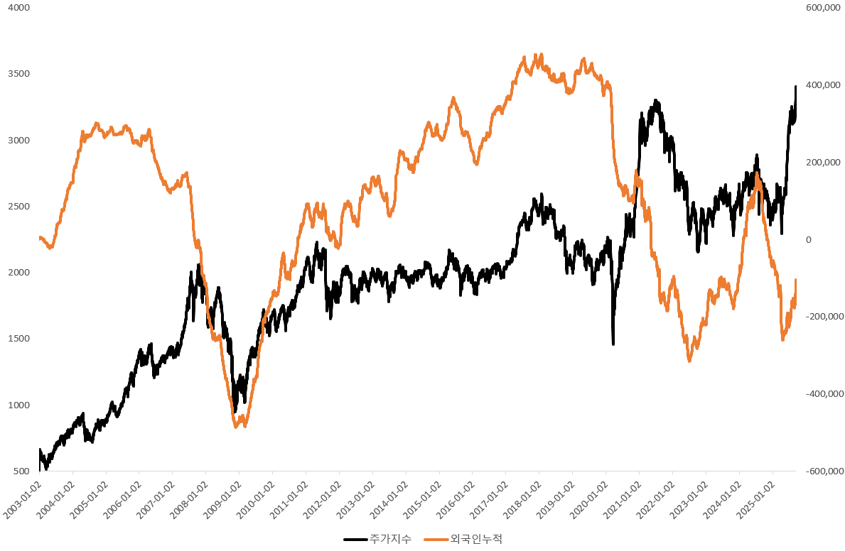[ 2003년 이후 최근까지의 외국인 투자자 누적 순 매매와 주가지수 추이 ]