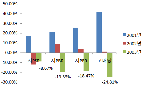 [ 2001년에서 2003년 당시 저평가 종목군들의 시장대비 수익률 추이.