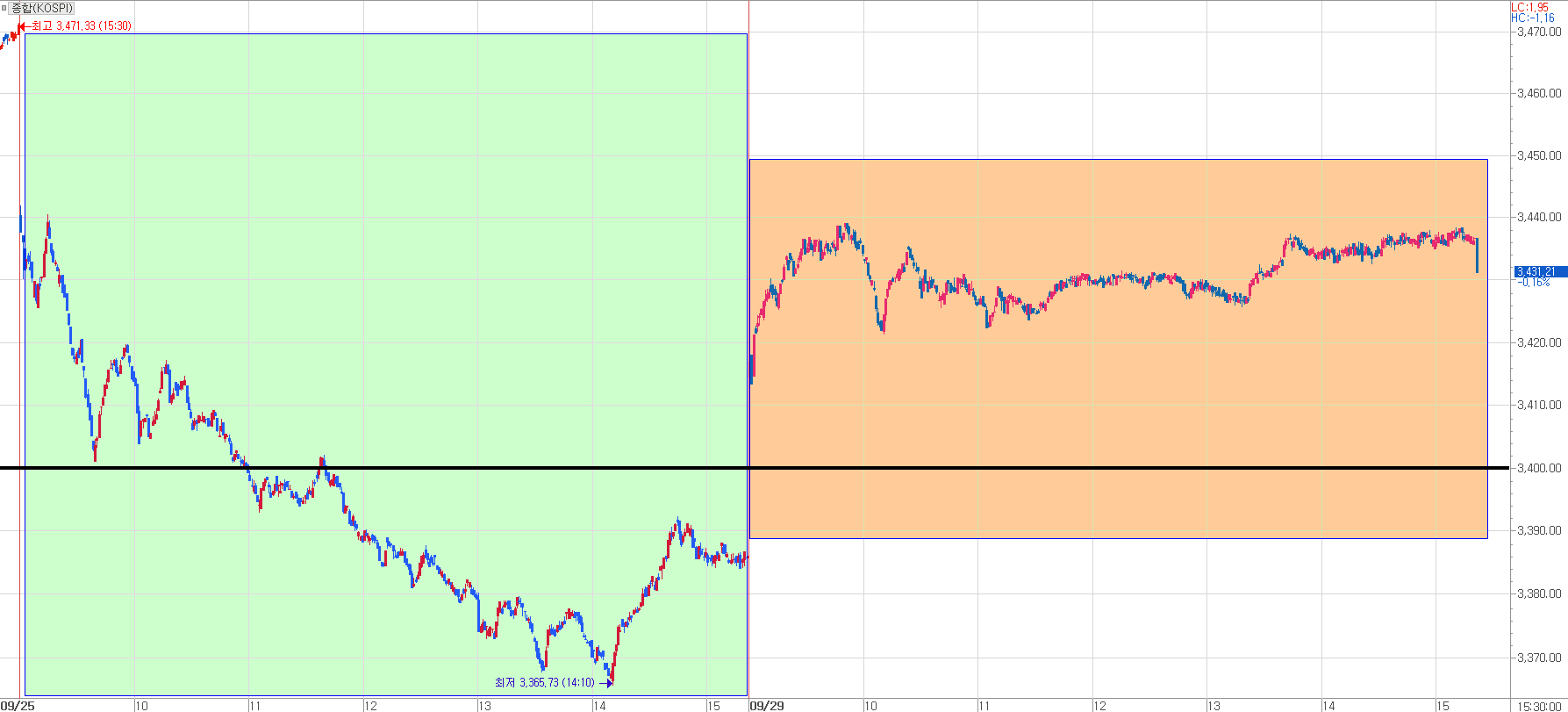 [ 금요일 급락이 있었지만, 월요일 오늘 증시가 강하게 반등하면서 3,400p 선을 회복 ]
