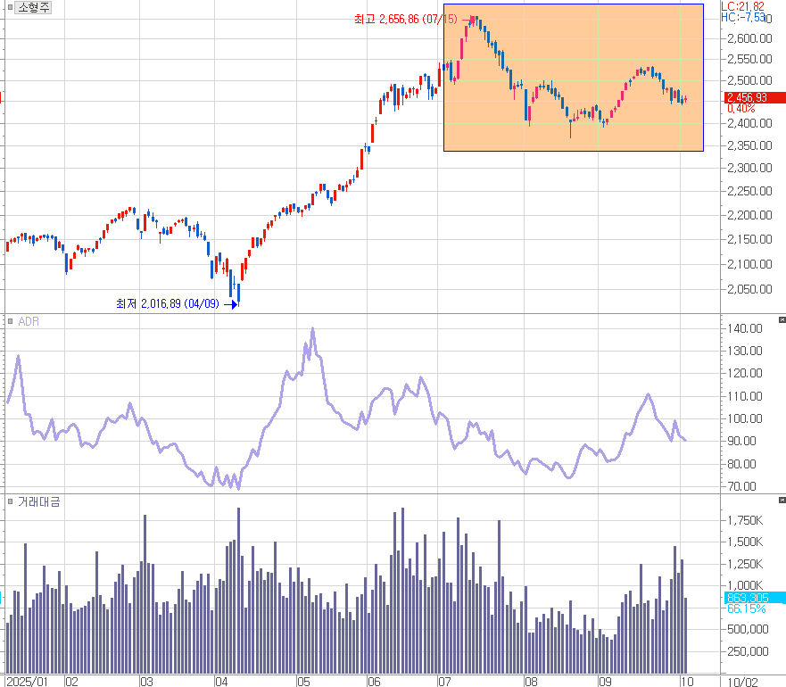 위의 차트는 코스피 소형업종 지수의 올해 흐름을 보여주고 있습니다. 5월까지는 코스피 지수와 비슷하거나 앞서는 흐름을 만들었던 개별 종목들의 흐름은 7월 초 이후 그 기세가 꺾이고 이후 최근까지 아쉬운 흐름이 반복되고 있습니다. 그 결과 ADR 지표 또한 그다지 개선되지 못하고 있는 상황입니다.