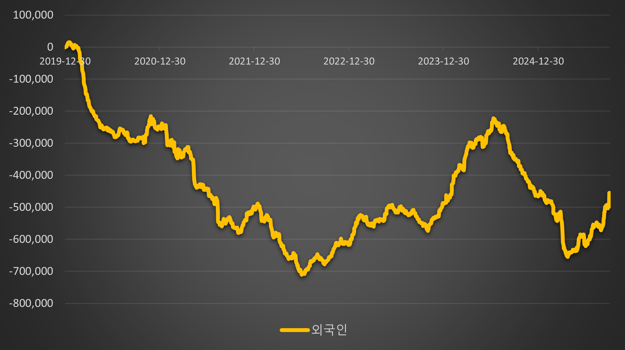 [ 2020년 연초 이후 최근까지 외국인 코스피+코스닥 누적 순 매매 추이 ]