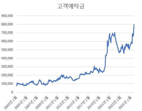 이후, 2022년 증시 조정을 거치면서 50조 원이 붕괴하는 등 예탁금 감소가 있었습니다만, 올해 들어 이재명 정부의 증시 부양 정책에 대한 의지가 강하게 반영되면서 예탁금은 60조 원과 70조 원을 순식간에 넘기더니 기어이 10월 13일(월) 기준 80조 원 선까지 넘어서면서 사상 최고치 기록을 세우고 말았습니다.