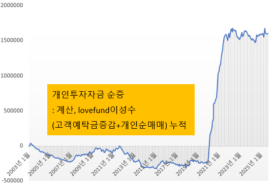 [ 개인 투자자금 순증 추이. 계산 : lovefund이성수 ]