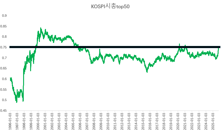 최근 주식시장 흐름은 코스피 시장 내 시총 최상위 종목들만 상승하고, 이 중에서도 삼성전자와 SK하이닉스만의 독보적인 상승이 연이어지고 있습니다. 이 덕분에 주가지수는 2025년 현재까지 연간 70% 가까이 상승하는 기염을 토하였습니다. 하지만 한편 그 이외 종목들의 상승률이 부진하고 심지어 되려 하락하는 종목들도 늘어나면서 코스피 시총 최상위 종목들의 코스피 시총 내 비중이 급격히 높아졌을 것이란 것을 대략 짐작할 수 있는 상황이지요.