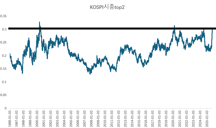 위의 자료는 1996년부터 2025년 10월 28일까지, 코스피 시장 내 시총 최상위 2종목의 코스피 시총 내 비중을 계산 분석한 자료입니다. 최근 30%선에 이르렀는데 이는 작년 2004년 7월, 2020년 3월 그리고 2000년 중반 30% 선을 넘은 이후 오랜만에 발생한 현상입니다.
