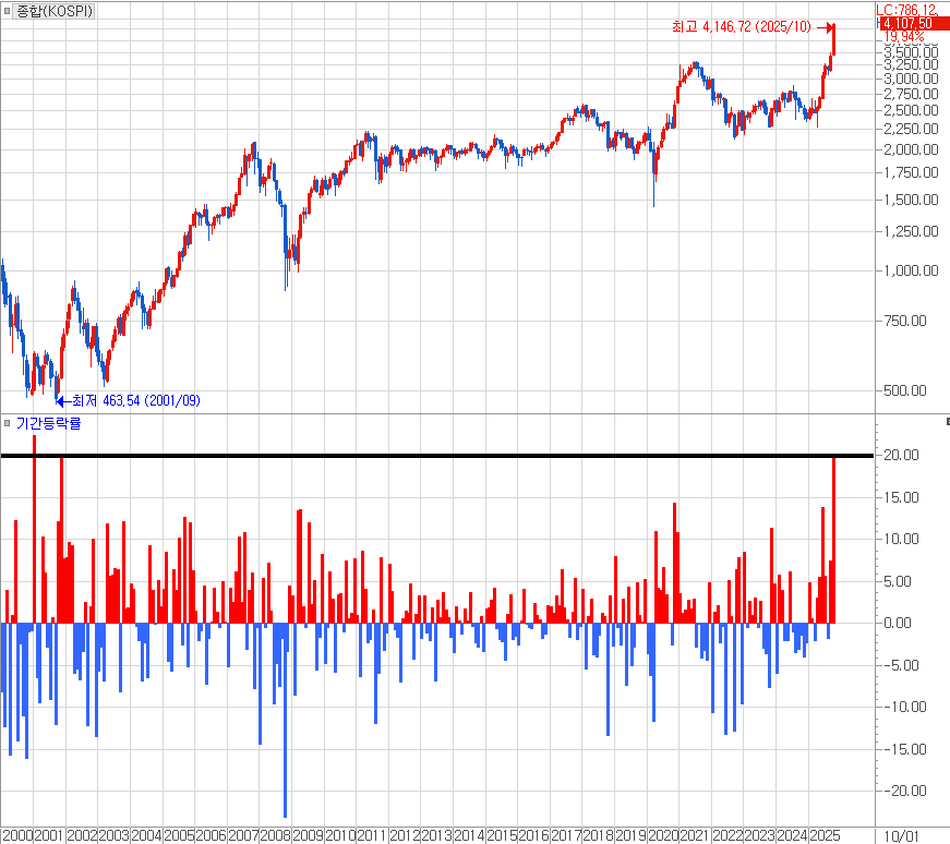 ■ 코스피 4,100p와 10월 월간 상승률 19.94%, 2001년 1월 이후 최고 기록