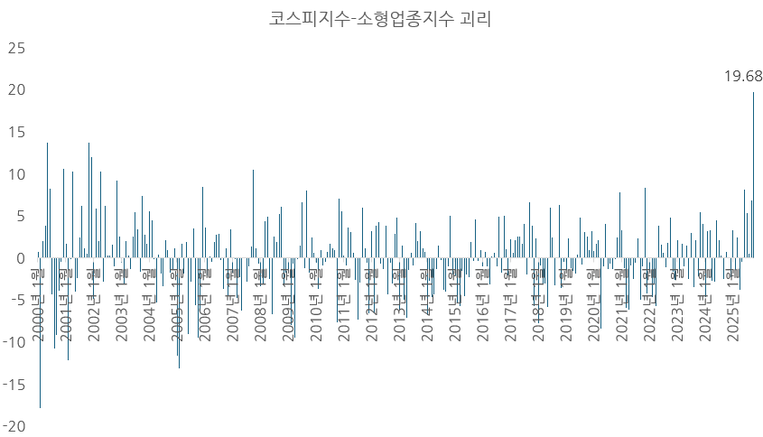 위의 도표에서 보시는 바와 같이 코스피 지수는 소형업종지수보다 압도적인 월간 상승 폭을 기록하였는데, 이는 2000년 이후 볼 수 없던 가장 큰 괴리도입니다.