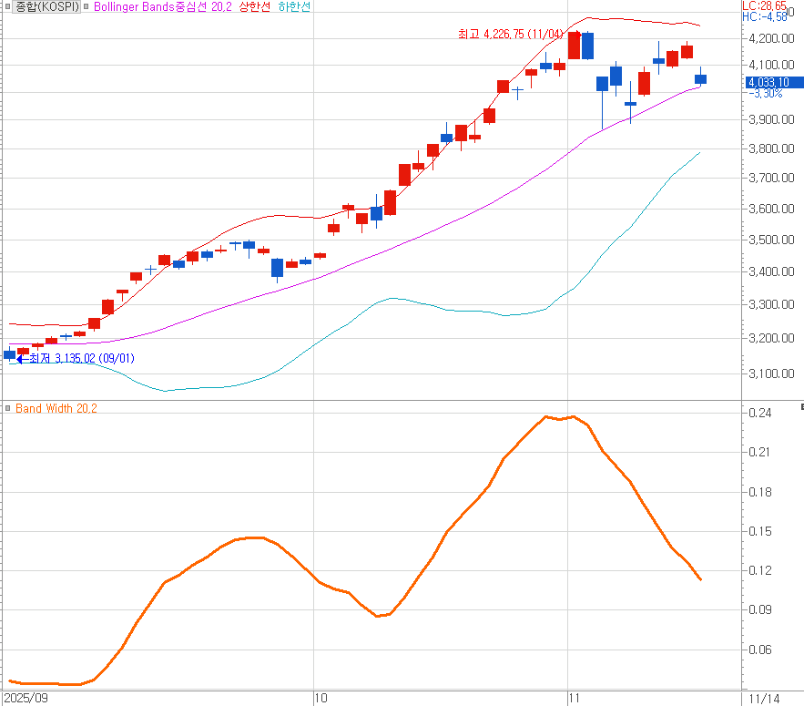 [ 9월 이후 코스피 지수 흐름과 볼린저밴드 그리고 Band width 지표 추이 ]