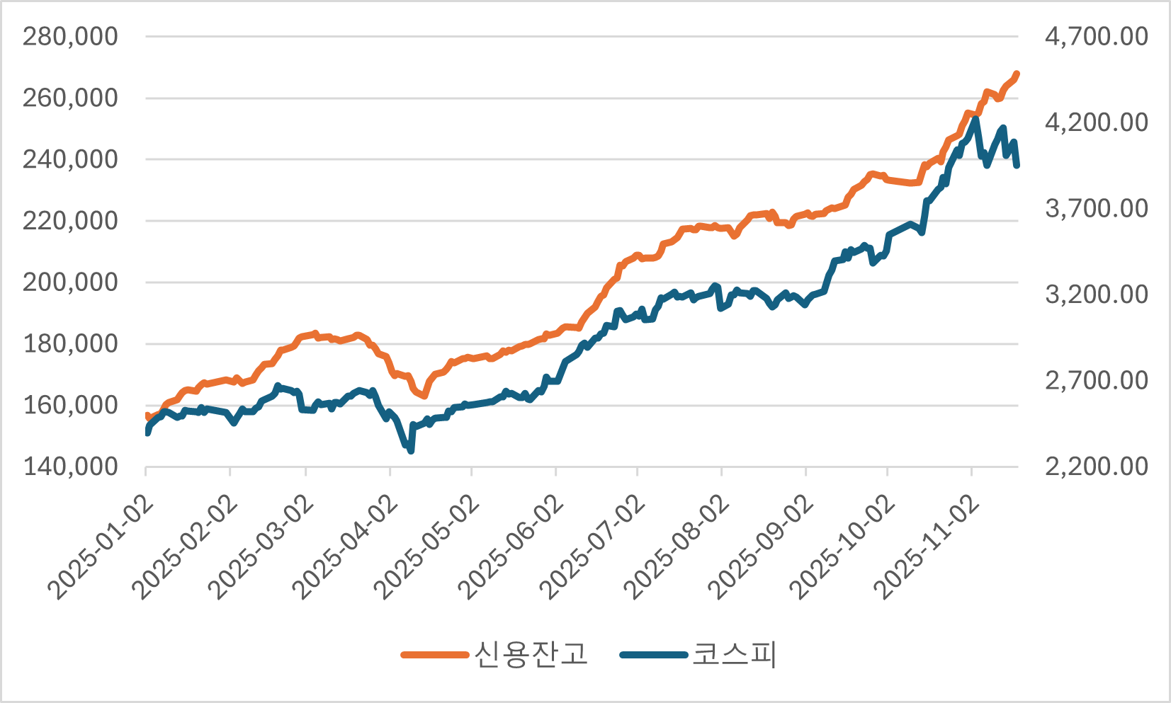 단적인 예로 올해 2월 증시가 숨 고르기 하던 시기에 신용융자가 증가하였는데, 4월 트럼프 관세 전쟁이 발표되고 시장은 제법 크게 밀렸었고 작년 2024년 가을 증시 조정기에 신용융자가 되려 증가세가 잠시 나타난 후 연말 12월에 계엄 사태와 정국 불안이라는 악재가 발생하자 시장은 더 민감하게 반응하였습니다.